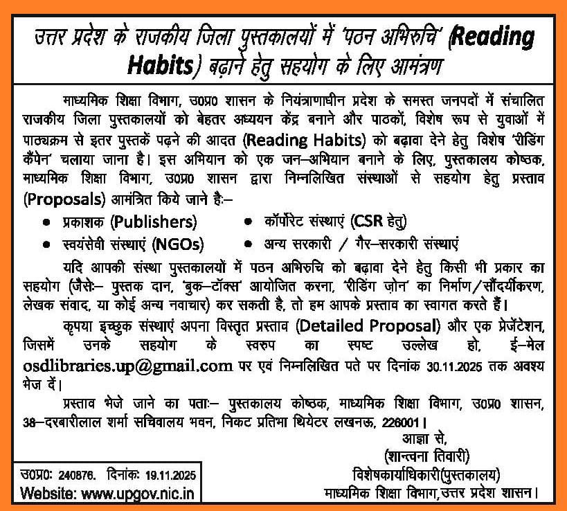 उत्तर प्रदेश के राजकीय जिला पुस्तकालयों में 'पठन अभिरुचि' (Reading Habits) बढ़ाने हेतु सहयोग के लिए आमंत्रण